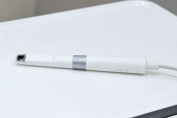 ペン型の細いカメラで、ユニットのモニターにリアルタイムでお口の状況を映し出します。小さなむし歯や歯ぐきの腫れなどを逐一ご確認いただき、ご納得いただいてから治療を進めるための大切なツールです。
