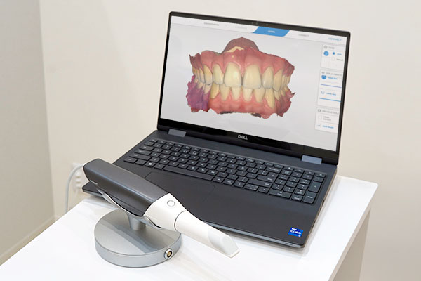 お口の中を小型カメラでスキャンし、精密なデータを取得する装置です。従来の型採りのように粘土のような材料をお口に入れる不快感や負担がなく、短時間で正確に歯型を採ることが可能です。