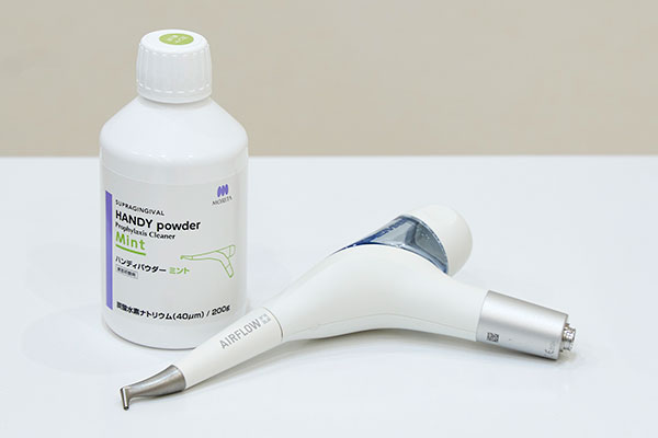 非常に微細なパウダーと水をスプレー状に吹き付け、歯の表面を傷つけることなく、着色汚れや歯垢を優しく除去します。従来の器具では届きにくい隙間まで徹底的にクリーニングできます。