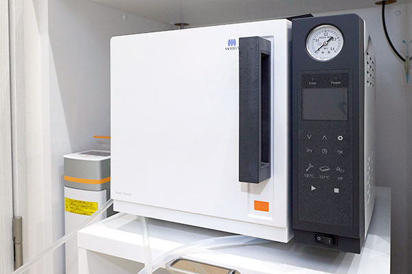 高温・高圧の蒸気によって、器具に付着したすべての細菌やウイルスを不活化させる滅菌装置です。当院では、お口に入るすべての器具は、患者さまに使用するごとに徹底した滅菌処置を施しています。