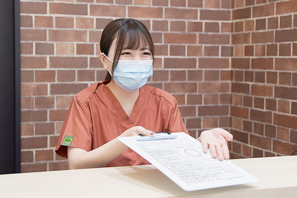 まずは受付にお越しください。健康保険証(またはマイナ保険証)のご提示をお願いいたします。その後、現在の症状や治療へのご希望、全身のお体についてなど、問診票への記入をお願いしております。