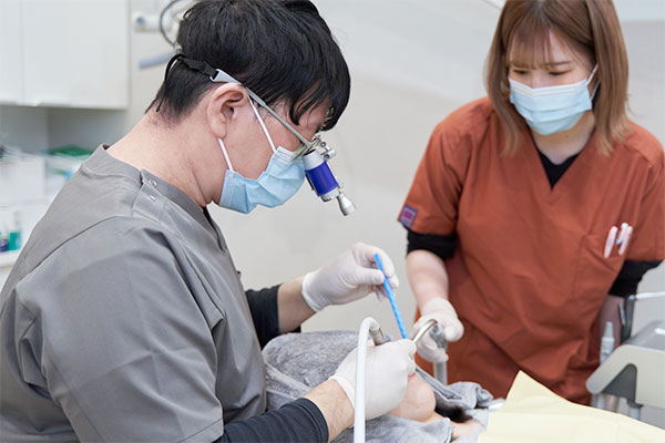 治療計画に沿って処置を進めていきます。当院では「保存」をモットーに、マイクロスコープや拡大鏡を駆使して、むし歯だけを精密に除去するなど、天然の歯を長持ちさせるための丁寧な治療を行います。処置の道中も必要に応じて写真をお撮りし、治療の進捗を共有しながら進めてまいります。